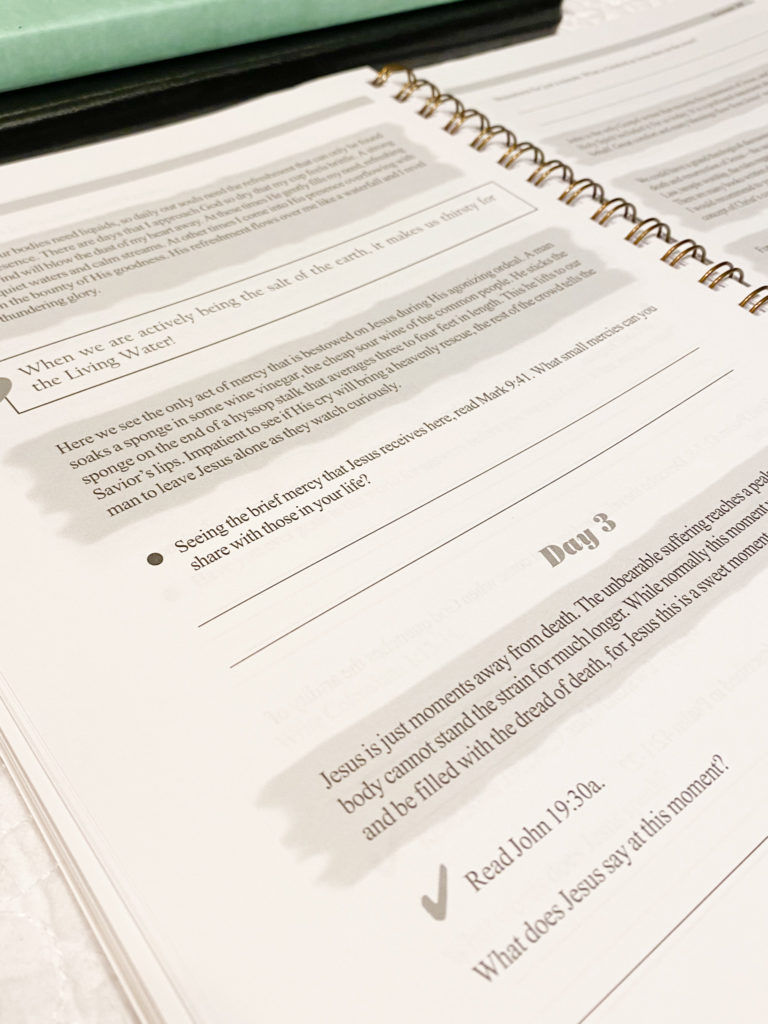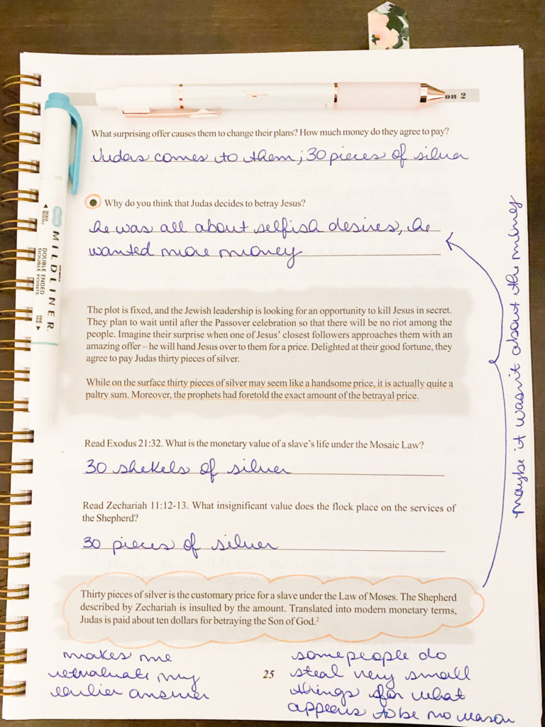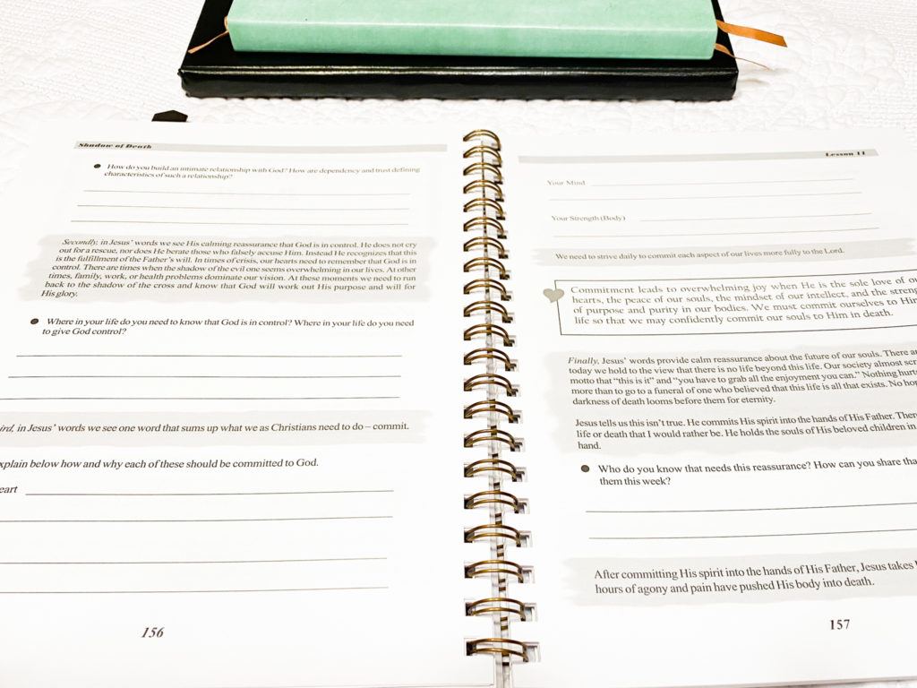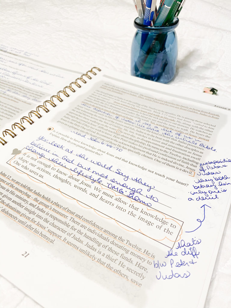 All three of the books I’ve worked in have had the same layout and structure. At first, she’ll ask you to dive into the text. The first few questions are about the passage and then she moves on to how that can be applied to our lives. She does a lot of “spiritual inventory” type questions. Which is one thing I love about this study! I think we should contemplate daily how we can improve.